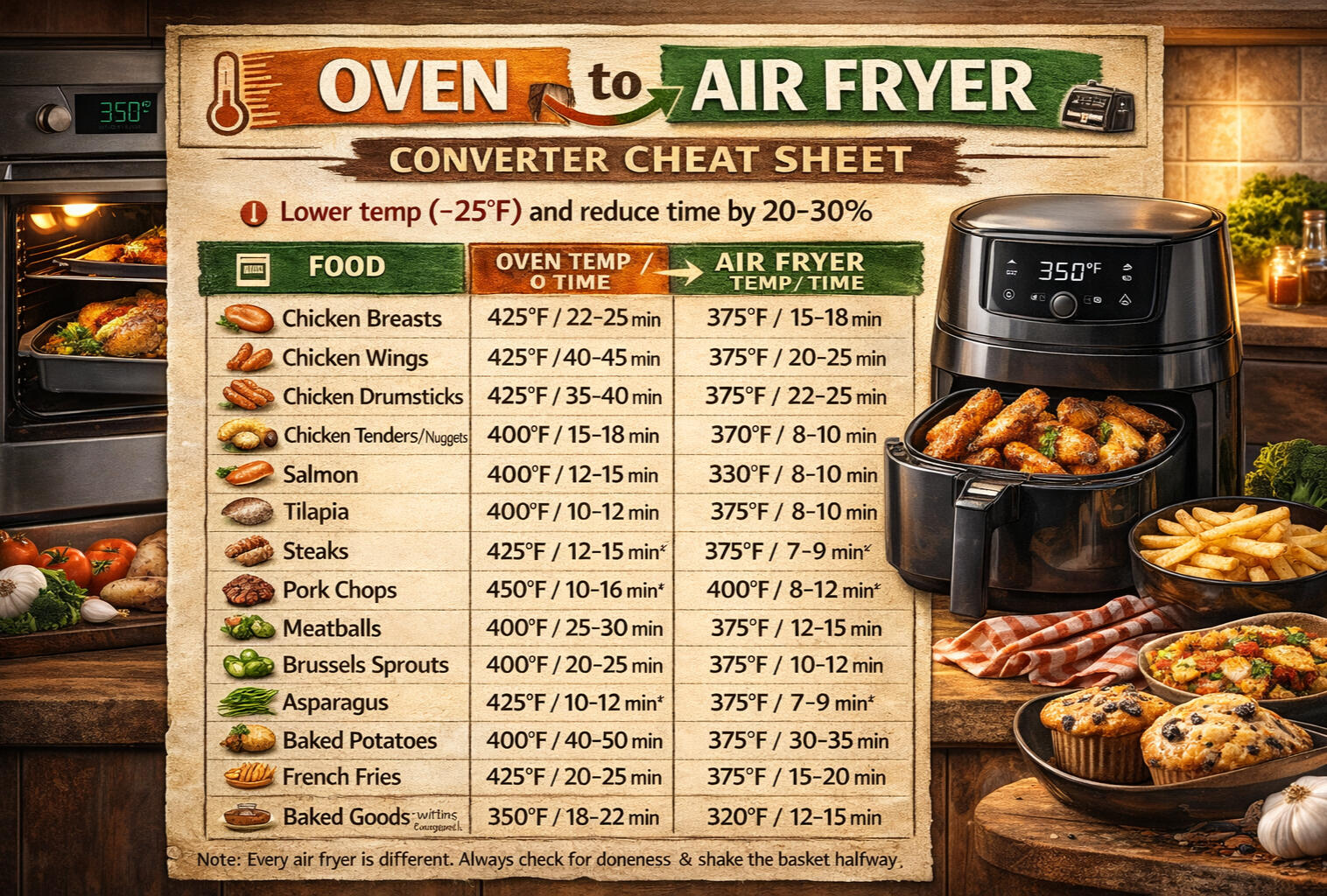 As a general rule of thumb, you should:Reduce the Temperature: Lower the oven temperature by 25°F (approx. 15°C).Reduce the Time: Cut the total cooking time by about 20% to 25%.Top 5 Tips for Air Fryer Success